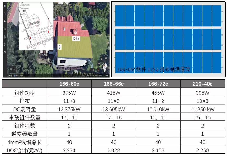 166的60c、66c組件可實現豎裝11×3排布,166-72c組件無法排滿3排,210-40c組件則只能排10列(10×3)。這種情況下,166-66c組件的總安裝容量最高,對應的BOS成本也就最節省。